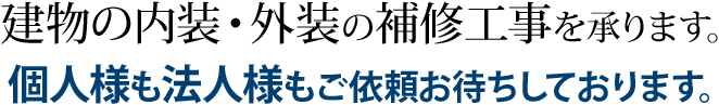 個人様は、お住まいの部分的な補修工事・リペアをお願いしたいという場合、ぜひご相談下さい。工務店様・管理会社様など法人様は、新築物件の施工中にキズをつけてしまったので直したい、管理物件の補修・リペアをしたい、という場合など、お気軽にお問い合わせ下さい。